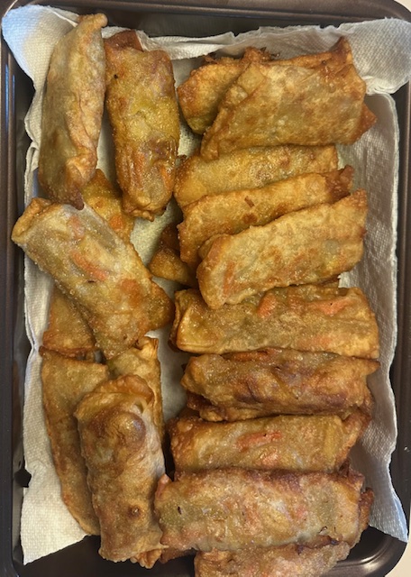 Golden Fried in a plant based wrapper. The filling is a mixture of seasoned ground pork, water chestnuts, bamboo shoots and scallions.